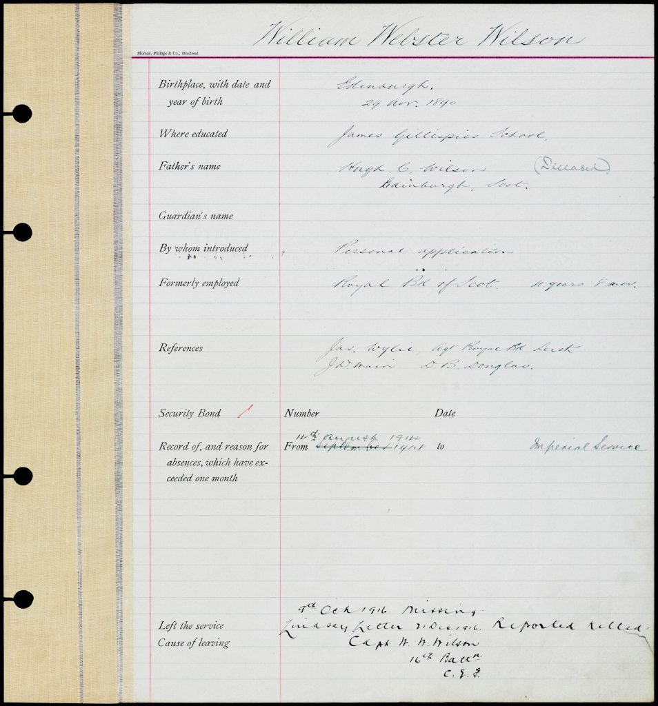 BMO is one of a few organizations with a private archive collection that has made some collections accessible to the public to further historical research and development. While researching, the Casualty Identification Program team came across our digitized HR ledger pages where Captain Wilson was featured. The ledger entry provided insight into Captain Wilson’s character, where he was described as “bright and hardworking,” and confirmed that he died while serving with the 16th Battalion.