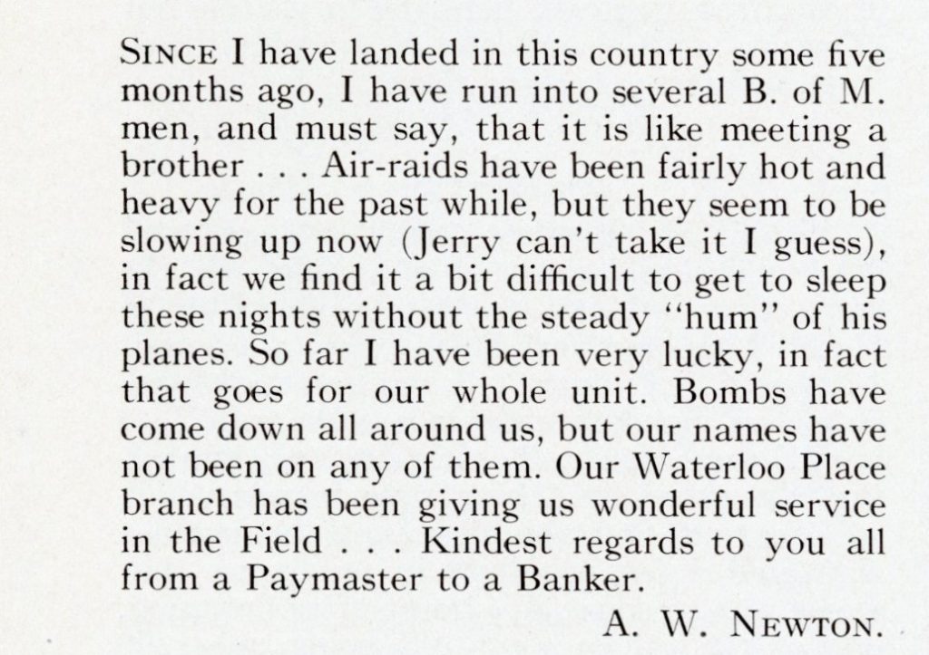 “Since I have landed in this country some five months ago, I have run into several B. of M. men, and must say, that it is like meeting a brother…Air-raids have been fairly hot and heavy for the past while, but they seem to be slowing up now […] So far I have been very lucky, in fact that goes for our whole unit. Bombs have come down all around us, but our names have not been on any of them. Our Waterloo Place branch has been giving us wonderful service in the Field…”
