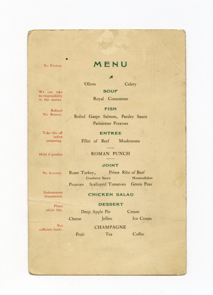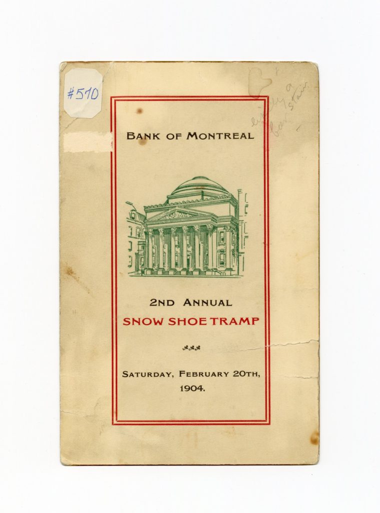 The Corporate Archives houses a collection of twentieth century menus from various events held by the bank. A favourite among the archivists is the menu from the Bank of Montreal Second Annual Snow Shoe Tramp. The menu details the meal that would have been served to bank staff at the conclusion of their snowshoeing journey (or, “tramp”).