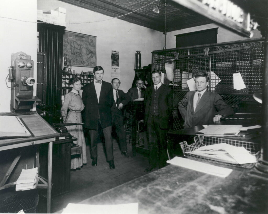 Photograph of the staff of the Estevan branch, including stenographer Ethel Viola Medcof, c. 1910.