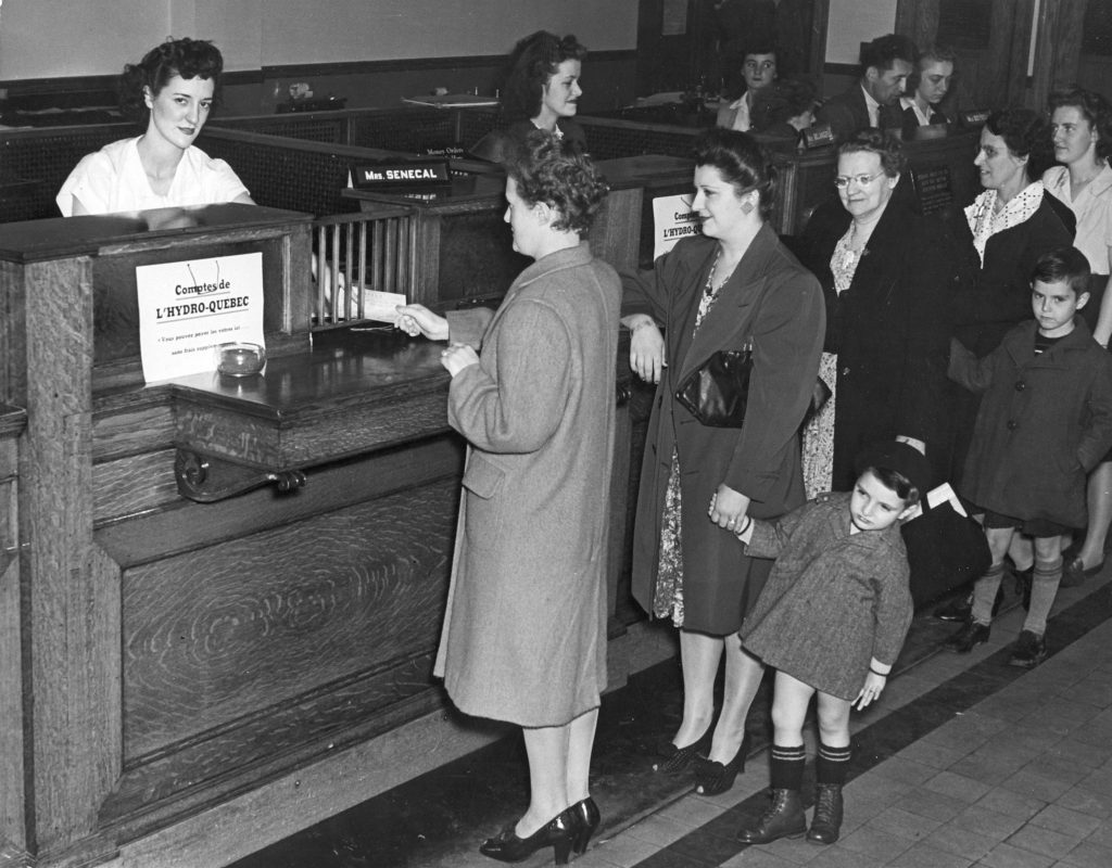Photograph of women employees assisting customers at the counter during the Second World War, Verdun, 4th Avenue & Wellington Street branch, September 1945.