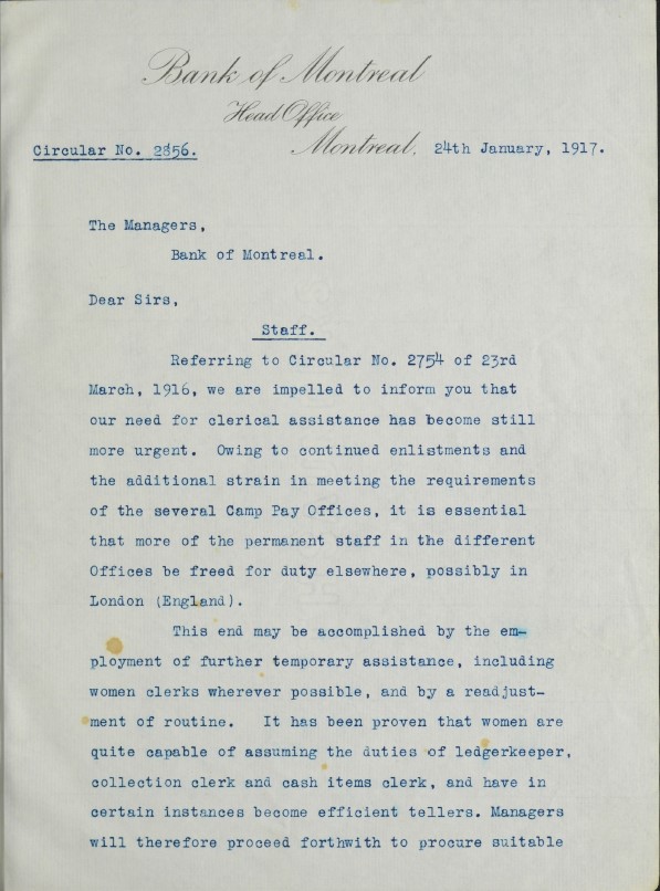 Bank of Montreal circular on the wartime employment of women, Circular no. 2856, 17 January 1917.