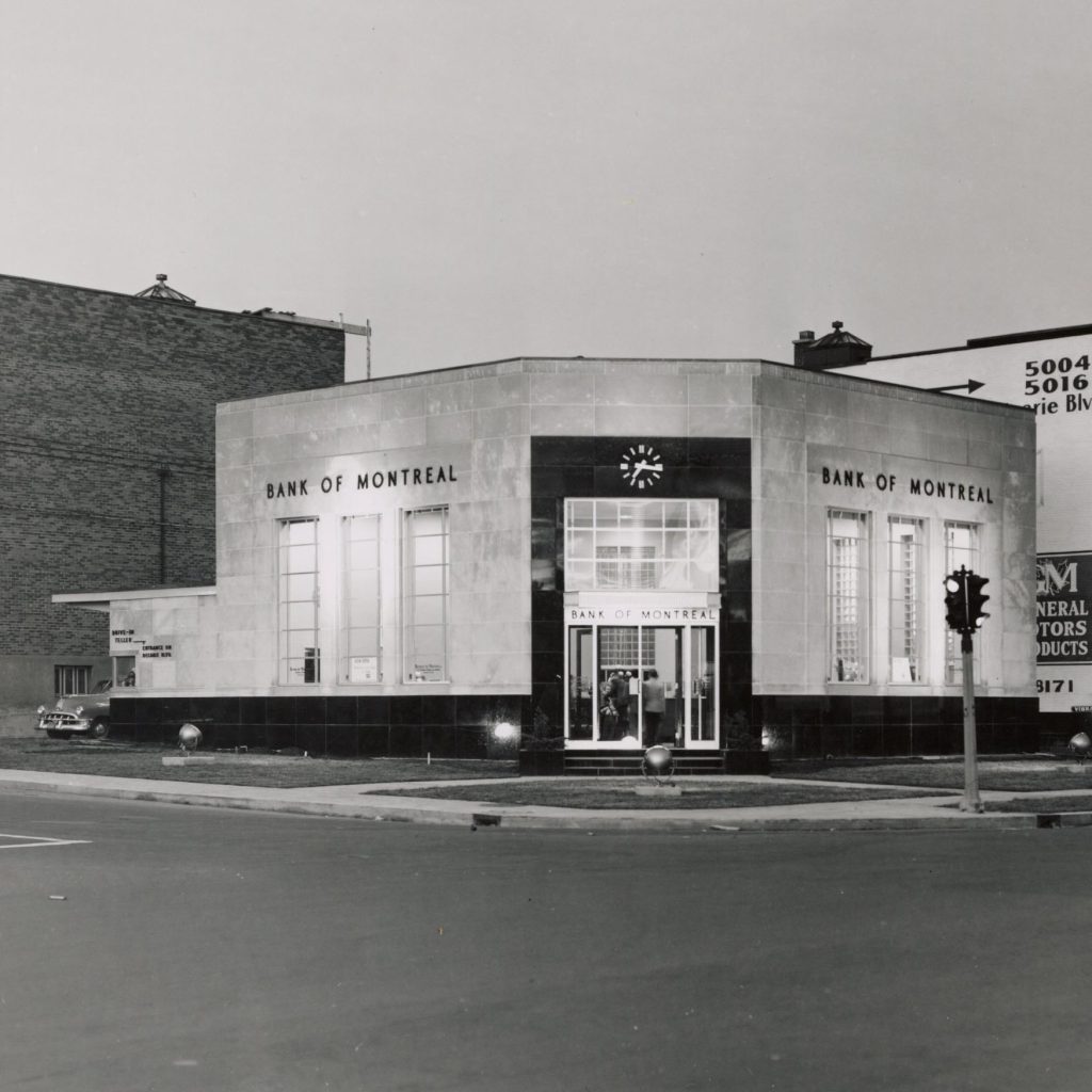 The Montreal Decarie and Plamondon branch opened in 1952, with a drive-in teller featured around the left side of the building. The exterior was constructed of Indiana limestone with black granite trim. This new, sleek look was typical for many branches constructed in the 1950s.
