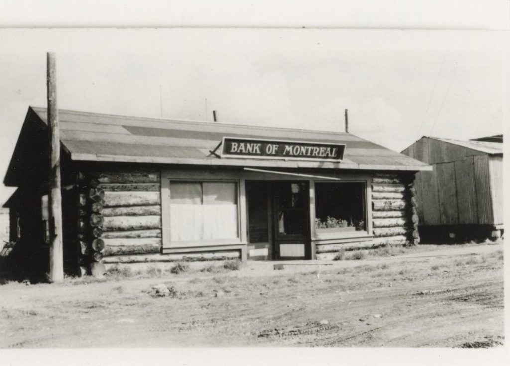 BMO’s first premises in Mayo, Yukon consisted of a log cabin. The branch opened in 1928 and serves as a good example of one of the more remote branches built by the bank during the expansion in the Northwest. A note on the back of the photograph describes the building as “rather crude looking, but warm and cozy inside.”