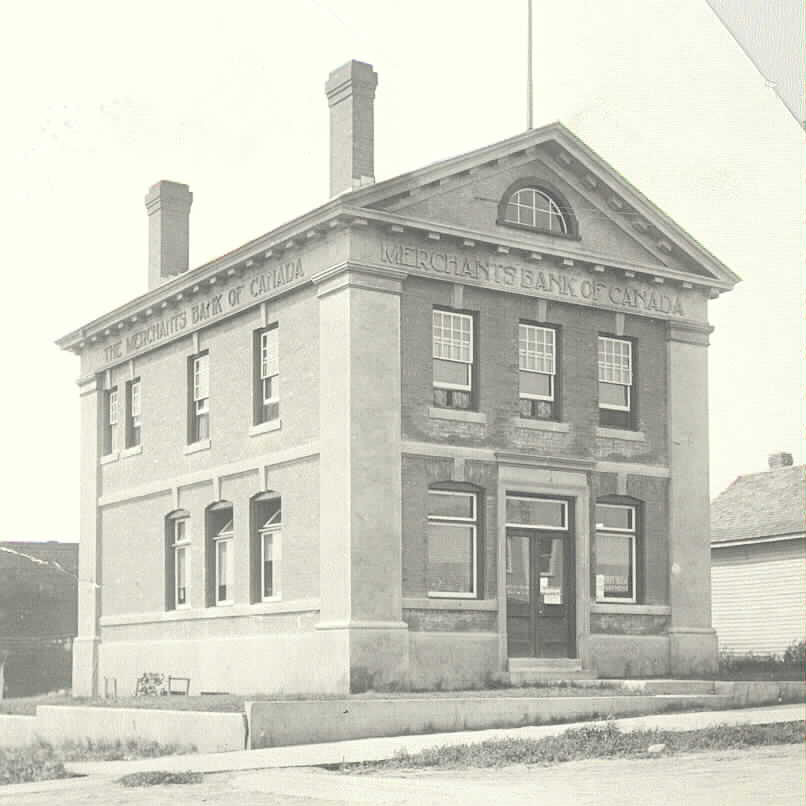 The Trochu, Alberta branch, originally a branch of the Merchants Bank, first operated in a small, frame shack. The bank moved into these premises on the corner of Main Street and 2nd Avenue when the building finished construction in 1914, a few years after the completion of the railway station in town. The boxy, simple construction with gable roof was characteristic of Merchants Bank branch architecture.