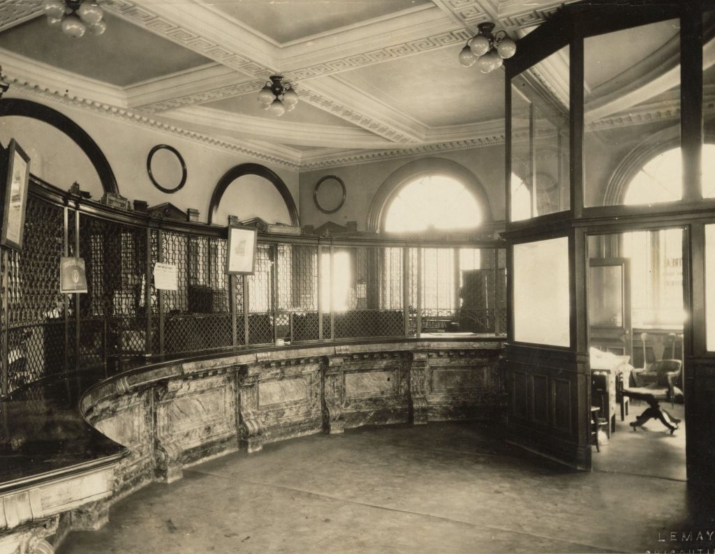 The interiors of early stone branches often reflected the same sturdiness and grandeur of the outside. Cages around the tellers wicket were also a key feature for protecting deposited funds.