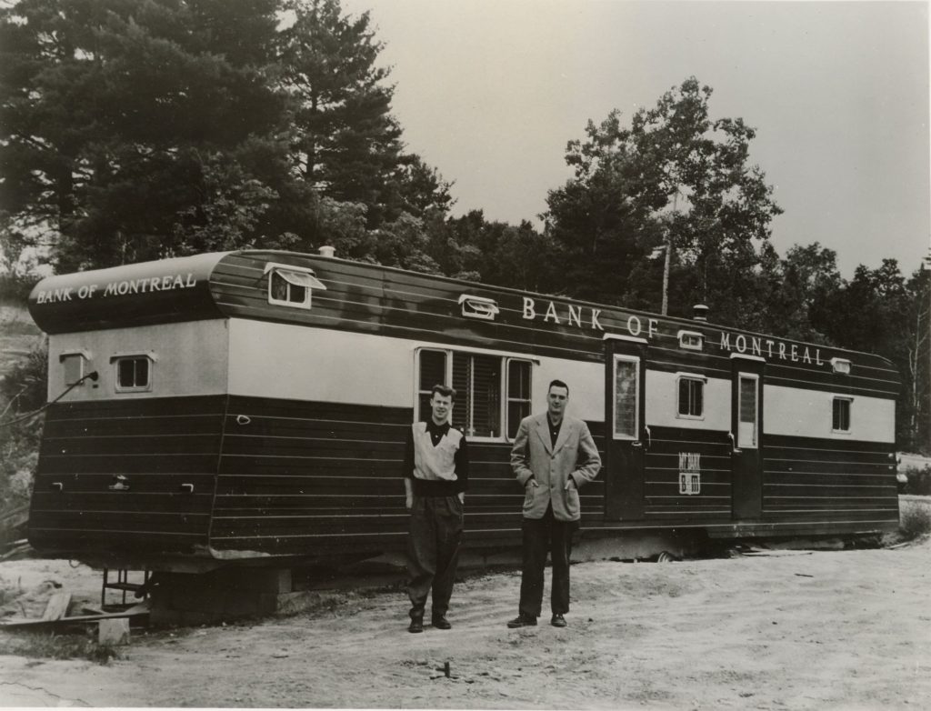 A trailer branch was set up in Elliot Lake, Ontario on April 12, 1955. The trailer had living quarters for a staff of two at the rear and was equipped to provide a wide range of banking services. The business end of the trailer, though compact, had a regular bank counter, a safe, a customer desk, and even a teller’s window.