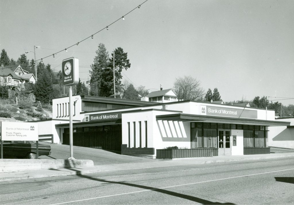 This branch in Gibsons, British Columbia with its sharp angles and emphasis on minimalism, demonstrates typical 1970s branch architecture. The photograph also shows the iconic Bank of Montreal clock at the front of the building.