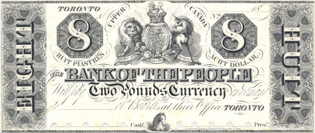 Bank of the People, Toronto, $8 note, 1840.