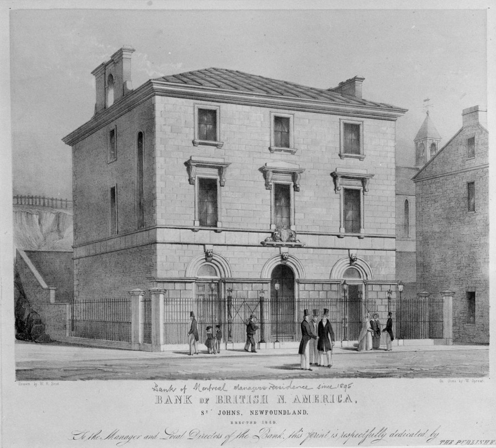 “The Bank of British North America, St. John’s Newfoundland – Erected 1849,” lithograph, W. Spreat, c. 1897.