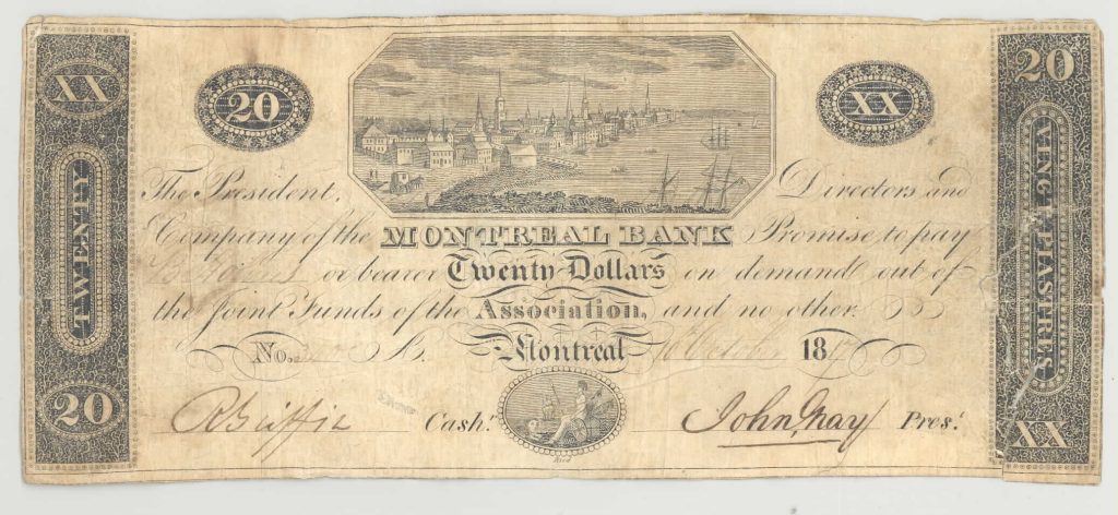 The first banknote issued by the Montreal Bank, signed by cashier Robert Griffin and bank president John Gray, features the port of Montreal. Before Montreal Bank came on the scene in 1817 to issue Canada’s first banknotes, the colony had no currency of its own, and cash was chronically in short supply. Most transactions in the domestic market were conducted under a system of barter. Merchants made do with a diverse mix of currencies that included shillings, francs, British Army notes, American dollars, Hudson’s Bay tokens, and pesos.