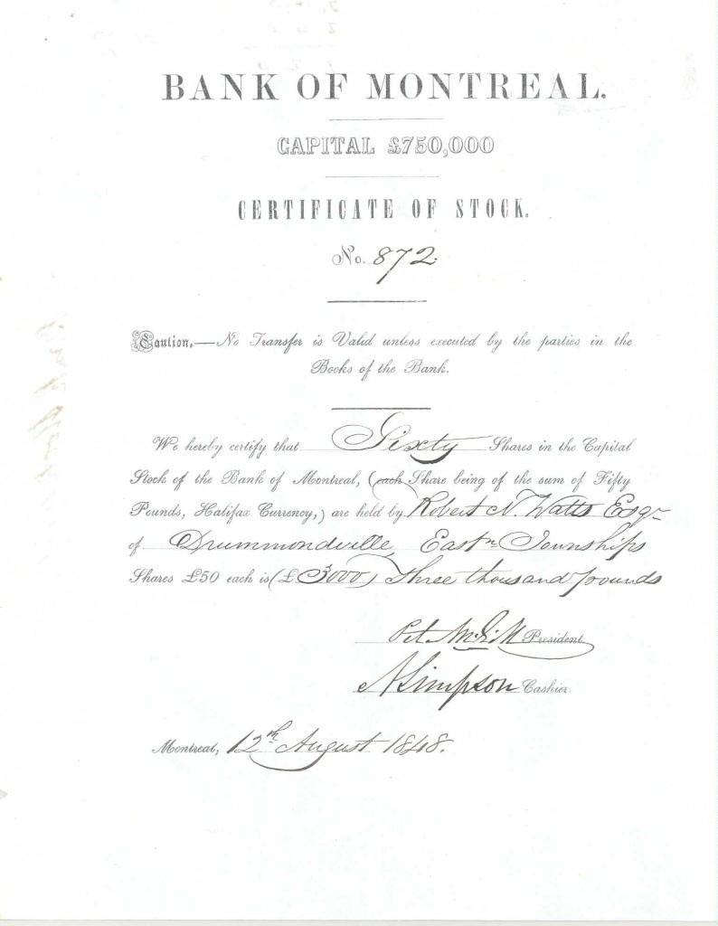 Shares in Bank of Montreal were among the first to be issued in Canada and played an important role in the nation’s emerging economy. Along with other bank and financial stocks, they helped to create an early securities market in Canada and a more sophisticated financial system of trade and exchange. The development of the Montreal and Toronto Stock Exchanges was the result.