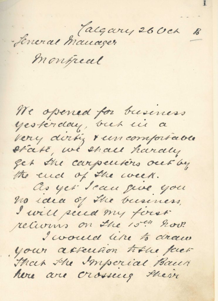 Letter describing the state of the just-opened Calgary branch, 26 October 1886.